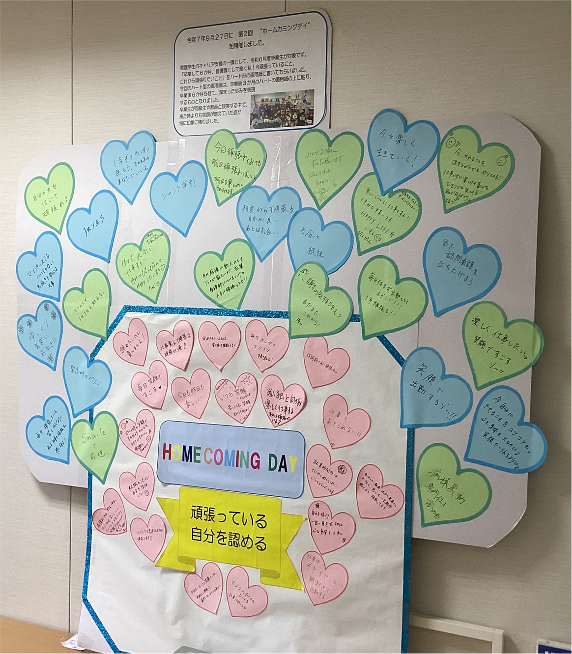 テーマは「卒業して6か月、看護職として働く私 〜今頑張っていること、これから頑張りたいこと」です。参加者にはハート型の画用紙に思いを綴っていただき、皆さんの想いが詰まったボードが完成しました。